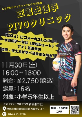『現役Fリーガー★しながわシティフットサルクラブ所属 笠篤史選手によるPIVOクリニック』開催のお知らせ