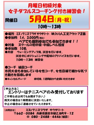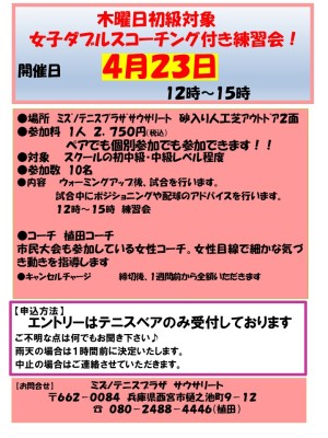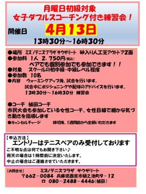 4月~5月個別参加OK!初級対象!女子ダブルスコーチング付き練習会